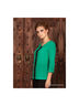 Блузка прямого кроя с рукавами длинной 3/4 и кружевным рисунком спереди. Застежка на пуговицу сзади.