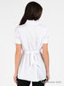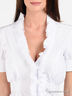 Детали: отложной воротник, украшен рюшами, короткие рукава с манжетами на пуговицах, спереди застегивается на пуговицы, бока присборены на резинку, плиссированная ткань, талия со шлевками на поясе