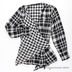 Детали: V-образный вырез горловины, запах, застежка на скрытую кнопку, складки, сборки, длинный рукав, манжеты на пуговицах