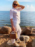 Базовая белая приталенная блузка, нежно украшенная жемчужными пуговицами. Выполнена из 100% хлопка. Создавайте как классической. так и романтические образы. Сочетается с любыми частями гардероба.