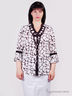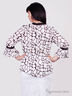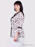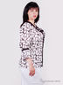 Изящная блуза из мягкого материала. V-образный вырез горловины. Застежка на планку с пуговицами. Прямые рукава 3/4 с небольшим расклешением от локтя. Полочки декорированы изящными вставками. Изделия дополнены контрастными однотонными окантовками.