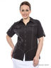 Великолепная блуза из полухлопкового материала. Стояче-отложной ворот. Застежка на планку с пуговицами. Короткие рукава с патами для фиксации декоративных отворотов. На полочке два накладных кармана с клапанами. Декоративные контрастные швы.