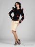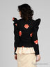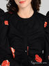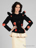 Полупрозрачная блуза черного цвета. Отложной двойной воротник. Длинный рукав. Манжеты фиксируются пуговицами. Потайная застежка с пуговицами. Полочка декорирована простроченным складками.