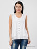 Блузка без рукавов из легкого поплина, с застежкой на пуговицы, V-образным вырезом, кокетками, мелкими складками по бокам, отстрочкой "зиг-заг" на складках синего цвета, сборками спереди и сзади и завязками сзади для регулировки ширины.