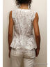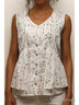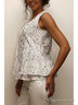Блузка без рукавов из ткани с набивным рисунком. Шов под грудью со складками, присборенный волан под грудью и внизу сзади.