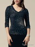 Блуза приталенного кроя с рукавами 3/4 и V-образным вырезом горловины. Выполнена модель в однотонной расцветке и дополнена декоративными элементами.