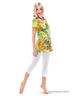 Блуза с короткими рукавами и округлым вырезом горловины. Изделие удлиненного покроя выполнено в яркой, контрастной расцветке. Отличный вариант на каждый день.