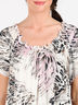 Детали: округлый вырез горловины, короткий рукав, вырез горловины и низ изделия со вставками из многорядной резинки, край рукава обработан оверлоком