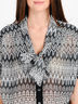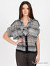 Детали: V-образный вырез горловины, ворот продляется завязывающимися лентами, короткий широкий рукав с манжетом, застежка на полочке на пуговицы