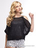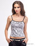 Модель состоит из двух частей. Внутренний топ на тонких черных бретелях из трикотажа с принтом под кожу питона; а также верхняя блуза из тонкого прозрачного шифона. Бретели шифонового топа представляют собой крупные цепи серебристого цвета.