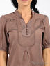 Легкая блузка из натуральной хлопчатобумажной ткани. На полочке выполнена кокетка с застежкой на пуговицы. Короткий рукав-фонарик посажен на манжету, которая завязывается на завязки. Свободный силуэт.