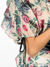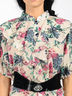 Воздушная, мягкая на ощупь блуза из лоснящегося материала. Небольшой воротник стойка. Застегивается на планку с пуговицами. Цельнокроеные рукава с завязками по краю. Украшена оборками.