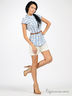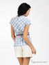Легкая хлопковая блуза из приятного на ощупь материала. Отложной воротник на стойке. Застегивается на планку с пуговицами. Короткие рукавчики, окантованные атласной лентой. Накладной карман на груди. Часть спинки посажена на многорядную резинку.
