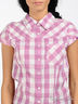 Легкая хлопковая блуза из приятного на ощупь материала. Отложной воротник на стойке. Застегивается на планку с пуговицами. Короткие рукавчики, окантованные атласной лентой. Накладной карман на груди. Часть спинки посажена на многорядную резинку.