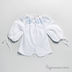 Детали: округлый вырез горловины присборен шнурком, широкий рукав присборен шнурком на конце, декорирована вышивкой и тесьмой