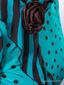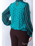 Женственная блузка полуприлегающего силуэта. Модель выполнена в ретро-стиле, модное сочетание полоски и гороха. Воротник-стойка, втачные рукава и оборка по переду — выполнены из полотна «шифон». Спинка изделия дополнена «капелькой» с застежкой на две п
