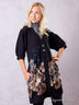 Удлиненный жакет полуприлегающего силуэта. Нижняя часть изделия выполнена из купонного полотна. Жакет застегивается на две декоративные пуговицы. Изделие дополнено карманами.
