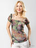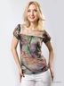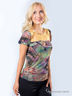 Детали: округлый вырез горловины, короткий рукав "фонарик" посажен на манжету, спереди кружевная вставка, принты