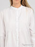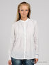 Легкая батистовая блузка белого цвета. Воротник стойка. Застегивается на планку на пуговицах. Длинные рукава с манжетами на пуговицах. Полочка декорирована защипами. Планка украшена тесьмой с народным орнаментом.