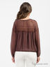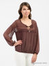 Блуза свободного покроя с длинными рукавами и округлым вырезом горловины с декоративными завязками. Манжеты и низ изделия - эластичны. Верх модели украшен вставкой из полупрозрачной ткани. Отличный вариант на каждый день.