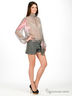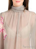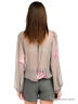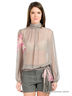 Шелковая блуза свободного кроя "летучая мышь", широкие длинные рукава, собранные на манжете в складки. Низ - отрезной широкий манжет на длинном поясе, украшенном бахромой. Декорирована цветочным орнаментом. Сзади на пуговицах.