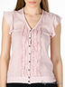 Трикотажная блузка приталенного кроя. V-образный вырез. Застегивается на кнопки. Полочка оформлена оборками.