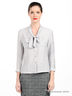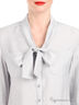 Детали: застежка на пуговицы, ворот-стойка переходи в завязывающиеся в бант ленты, два нагрудных кармашка, манжеты на пуговице