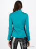 Оригинальная блузка яркого бирюзового цвета, выигрышно подчеркнет фигуру, благодаря приталенному силуэту. Тонкая трикотажная ткань, приятная на ощупь. Застежка на пуговицы. Воротник-стойка с декоративной вставкой, присборенной спереди. Длинный прямой рукав с манжетой на двух пуговицах.