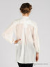 Легкая шелковая блузка-туника. Свободный силуэт. Отложной воротник-стойка. Планка-застежка с пуговицами. Длинный рукав. Манжеты на резинке. На полочке и рукавах выполнены декоративные складки с прострочкой. Полочка декорирована вышивкой бисером, пайетками и стразами.