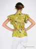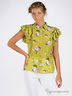 Легкая шелковая блузка приталенного кроя. Без рукавов. Проймы декорированы широкими воланами. Отложной воротник. Застежка на пуговицы, обтянутые тканью в тон.