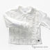 Блуза для девочки белого цвета. Выполнена из очень мягкого и гладкого трикотажа: хлопок с небольшим добавлением эластана. Отложной воротник, передние полочки и низ рукавов украшены нежными оборочками. Застегивается на пуговицы. Украшена медальоном в виде сердечка, с логотипом Salty Dog