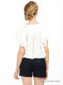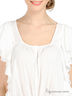 Детали: круглый вырез, короткие рукава с многослойными воланами, спереди застегивается на пуговицы, снизу завязывается на бант