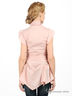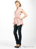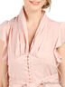Детали: v-образный вырез с отложным воротом, короткие рукава-воланы, широкий втачной пояс, застегивается на пуговицы, талия со шлевками и на поясе, низ оригинально расклешен