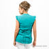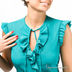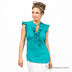 Стильная блузка с круглым вырезом горловины и короткими рукавами. Спереди блузка декорирована жабо, вырез рукавов украшен рюшами. Сзади блузка завязывается на поясок.