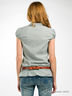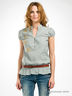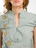Женская хлопковая блузка. Воротник стойка. На полочке застежка на пуговицы. Широкая пройма, небольшие рукава фонарики с резинкой по краю. Многорядная резинка на поясе. Украшена вышивкой из бисера.