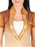 Детали: v-образный вырез с отложным воротником-стойкой, короткие рукава-фонарики на резинке, спереди украшена кожаными вставками и клепками, на полочке накладной кармашек с бисером и пайетками