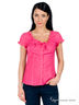Детали: круглый вырез с оборкой, короткие рукава-фонарики на резинке, спереди застегивается на пуговицы и веревочку
