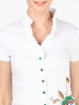 Детали: ворот-стойка декорирован оборкой, застежка на пуговицы, короткий рукав, полочка декорирована аппликацией с вышивкой