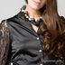 Роскошная атласная блузка с гипюровыми рукавами. Застегивается на пуговицы. Приталенный крой.