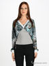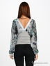 Яркая блуза создает женственный и чувственный силуэт с тонкой талией, высоким бюстом и открытой шеей. V-образный вырез на лифе и спинке окантован жемчужно-серым атласом. Длинные широкие рукава реглан с атласными манжетами на пуговице выполнены из воздушного шифона с оригинальным многоцветным принтом. Линия талии подчеркнута светло-серым трикотажем.