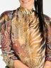 Блуза из тонкой струящейся ткани прямого силуэта. Воротник- стоечка завязывается на ленту. Рукава и низ изделия присборены резинкой.