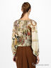 Легкая, воздушная блузка из тонкой шелковистой ткани. Завязывается на ленточки на спине. Длинный цельнокроеный рукав собран на манжету. Спереди полочка декорирована пуговицами. Низ изделия на широкой многорядной резинке.