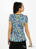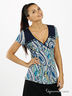 Стильная блуза отрезного кроя из струящейся ткани отлично подойдет для повседневной носки. Очень приятная на ощупь тонкая синтетическая ткань. V-образный вырез горловины с запахом обработан трикотажной лентой. Короткий рукав. Под грудью вшита резинка. Блуза декорирована трикотажными вставками и рюшами.