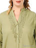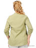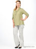 Детали: отложной воротник, застежка на пуговицы, длинный прямой рукав присборен на манжету с двумя пуговицами, полочка и спинка декорированы перфорацией