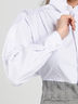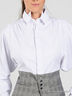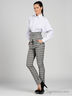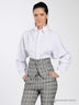 Приталенная блузка из легкого лоснящегося материала. Отложной воротник оригинального дизайна. Застегивается на пуговицы спереди. Длинные рукава с хлястиком на пуговице. Спереди вставки из полушерстяной ткани в клетку. Два прорезных кармана. На спинке хлястик и небольшой разрез.