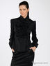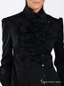 Приталенная блузка из легкого лоснящегося материала. Многослойный отложной воротник на стойке. Застегивается спереди на пуговицы. Длинные рукава с манжетами. Полочка декорирована бантами.