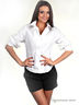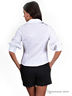Классическая приталенная блузка. Отложной воротник-стойка, рукава 3/4 с манжетами на пуговицах, спереди застегивается на пуговицы.