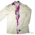 Классическая и легкая блузка на пуговицах. Воротник стойка, длинные рукава с манжетами на пуговицах, полочка украшена рюшами и яркими декоративными вставками.