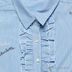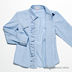 Детали: отложной ворот-стойка, застежка на пуговицы, манжеты на пуговицах, планка-застежка оформлена оборками, полочка украшена вышивкой, на спинке декоративный хлястик-бантик