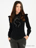Детали: отложной ворот-стойка, застежка на пуговицы, длинный рукав, манжеты на пуговицах, вытачки, полочка декорирована